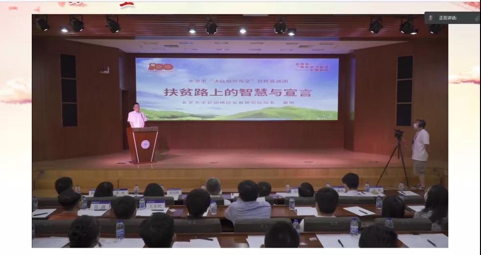 本次课程由北京师范大学中国扶贫研究院院长张琦、北京师范大学马克思主义学院教师郝海燕讲述脱贫攻坚导论,脱贫攻坚先进事迹宣讲团成员雷明、赵可等人分享了自己脱贫攻坚事业中的工作经历和取得的成果。