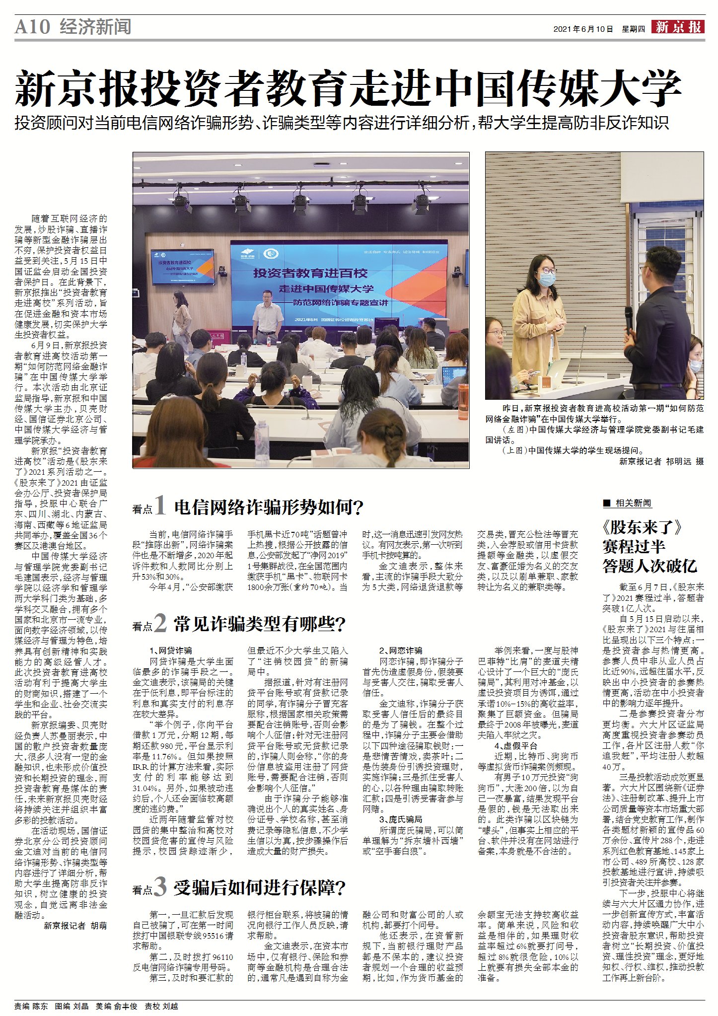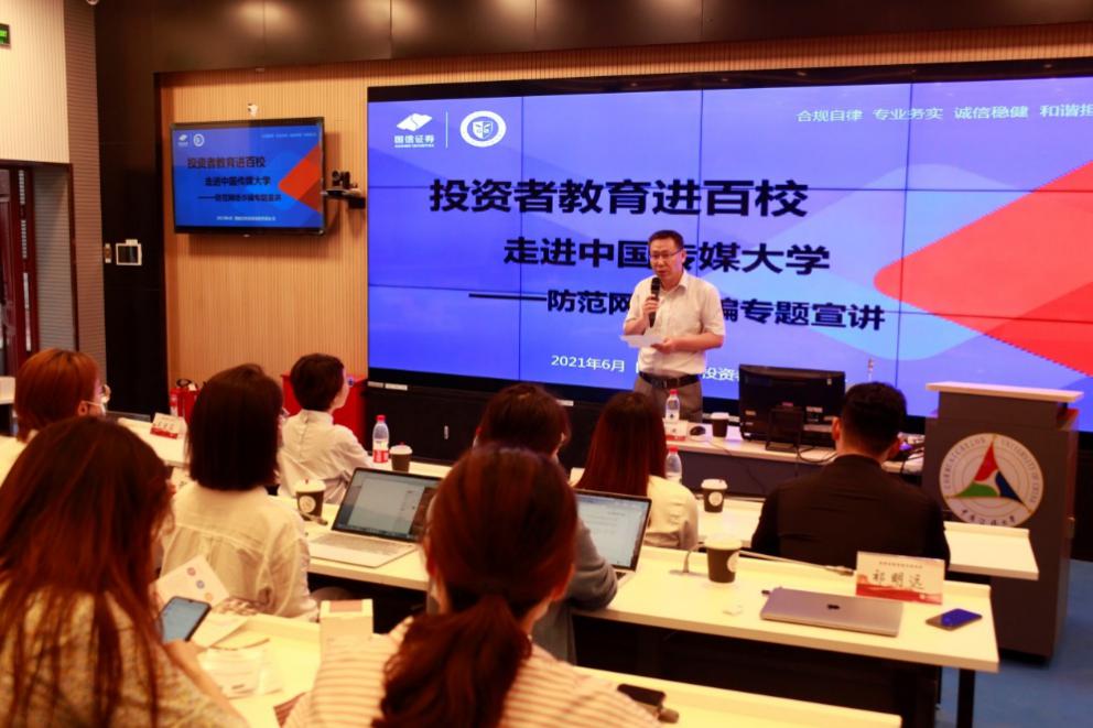 (通讯员 徐智慧 伊善乐 摄影 吴居嫦)6月9日晚,由中国传媒大学、新京报主办,中国传媒大学经济与管理学院、贝壳财经、国信证券北京分公司承办的“投资者教育进百校之走进中传——如何防范网络金融诈骗”专题讲座于33号楼一层报告厅顺利举办。本次讲座特邀国信证券北京分公司首席投资顾问金文迪先生讲授。新京报编委、贝壳财经创始人苏曼丽,新京报经济新闻部主编李蕾,《新京报》财经记者祁明远、邢赛赛、胡萌和国信证券北京分公司投教专员姜明出席讲座,经济与管理学院党委副书记毛建国主持讲座。