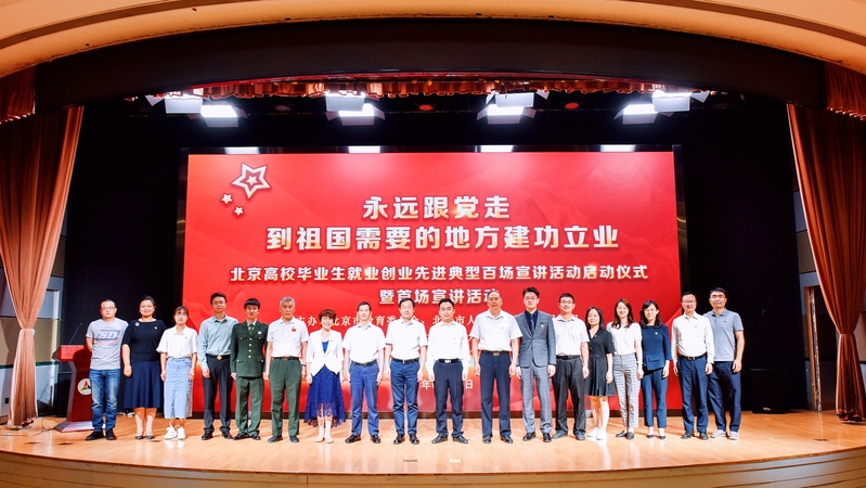 随后,到会嘉宾及宣讲代表清华大学王岩、中国传媒大学姚衣凰上台,共同启动北京高校毕业生就业创业先进典型百场宣讲活动。