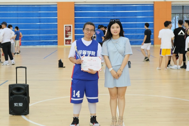 校团委常委、校学生会副秘书长周子颜为女篮联赛决赛MVP顾恩澍颁奖