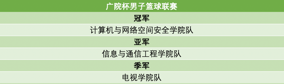 广院杯男子篮球联赛决赛由计网队对阵信通队。上半场,首节开打两队都采取了高压防守,场面一度胶着,双方节奏不断加快,比分交替上升。半场结束,计网队18:16信通队。下半场易边再战,比赛十分激烈。计网队10号麻家宾展现出他强大的个人能力,带领计网队保持领先优势。最终计网队41:32信通队取得了总决赛的胜利,捧起荣耀奖杯。