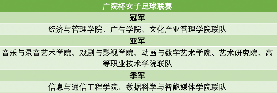 (通讯员 张雁岚 范语田 摄影 图源中国传媒大学学生会)6月18日,由校团委和校体育部联合主办、校学生会体育部承办、校研究生会协办的第三十三届“百年奋进·凝心聚力”中国传媒大学广院杯系列比赛正式落下帷幕。在本届赛事中,男子足球联赛的桂冠由信息与通信工程学院队一举夺得;女子足球联赛由广告学院与经济与管理学院联队夺得冠军;男子篮球联赛的冠军杯由计算机与网络空间安全学院队捧起;女子篮球联赛则由经济与管理学院队摘得冠军。