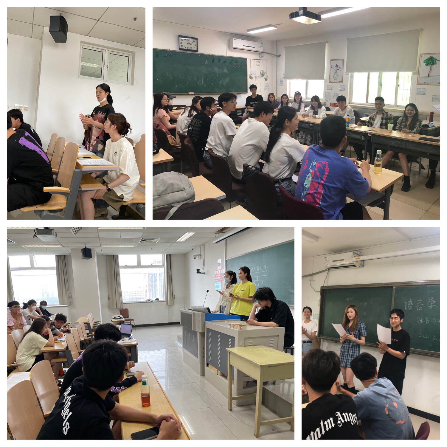 在本学期“语言学概论”的课程改革中,任课教师设计了多次与播音主持专业密切相关的实践活动:“花式配音”让同学们在使用多种语言或方言配音的过程中感受不同语种的区别与联系;“语言生活问题街采”让同学们走上街头、深入校园,感受语言学在生活中的运用,在实践中加深思考,感受到了语言学的魅力。