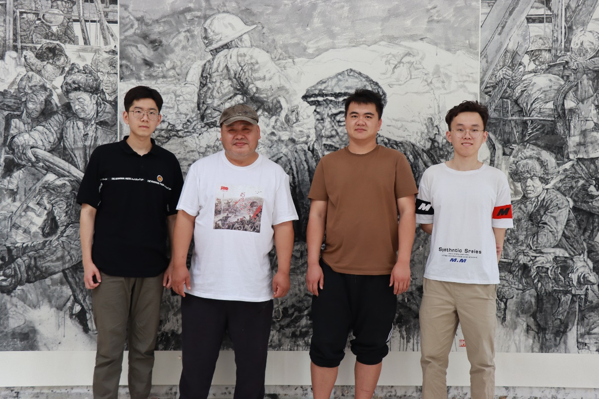 李宽教授以认真负责、精心打造艺术精品为目的。坚持为人民服务、为社会主义服务的方向,将此次创作项目作为教学活动,带领研究生劳政超、王铉文、丁圣乾参加此次美术作品展,可谓教学成果颇丰。从两件美术作品的完成到展览,一方面作为美术学专业的创作实验课题研究,带领学生进行美术创作的当代探索,解决写实性与水墨人物画的融合问题,并取得了良好的成效;另一方面,从课堂教学延伸至社会创作实践,通过主题性美术创作,引导学生们作为新时代的美术工作者要像习近平总书记要求的那样,珍惜时代机遇,与时代同行,倾心投入、潜心创作,更加自觉地走进时代、融入时代,深刻反映我们这个时代的历史巨变,用智慧和辛劳描绘这个新时代的宏大精神气象。