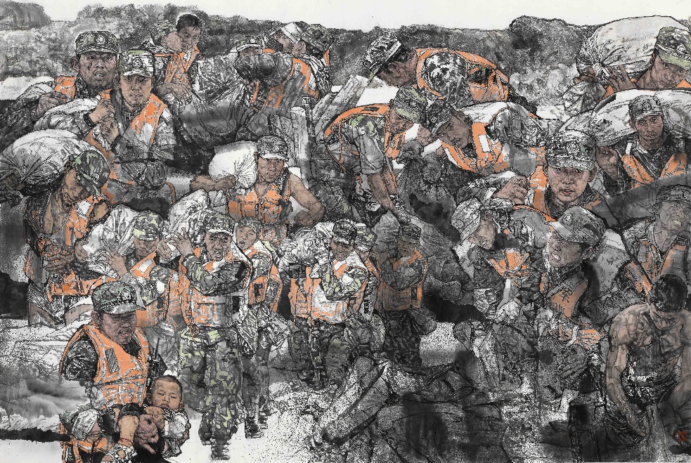在《众志成城》创作中,作品场景以横幅构图为主,同时创新性的采用了多维度、多视角的人物以及场景的并置,对画面的黑白灰构成、笔墨规律、色彩关系等画面要素进行了分析和处理。画面生动地刻画了中国人民子弟兵在洪水泛滥之际,奋不顾身的搬运物资、拯救人民、抢险救灾的一幕幕场景,竭尽全力般的人物表情与争分夺秒的动作场景共同营造出一种既庄严又热烈的画面氛围。