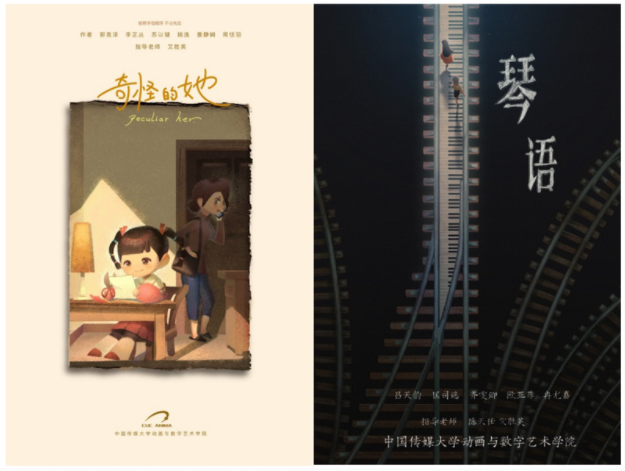 《奇怪的她》是2016级动画专业学生苏以键、周恬羽、郭竞泽、李芷丛、姚逸、詹静娴在艾胜英老师指导下创作完成的毕业设计短片,讲述了一个单亲家庭的小女孩因偷偷为忙于工作的妈妈准备爱心礼物而让妈妈产生误解的温馨故事。《琴语》是2016级动画专业学生吕天韵、匡司选、齐雯卿、欧亚菲、冉尤嘉在陈天任、艾胜英两位老师共同指导下创作完成的毕业设计短片,讲述了两个各怀伤心事的少男少女在火车上偶遇,借助钢琴语言彼此慰藉的故事。