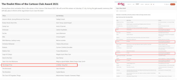 (通讯员 张若琦)6月29日,2021意大利Cartoon Club国际动画电影节官网发布入围名单,我校动画与数字艺术学院五部师生作品榜上有名,教师作品《越女长歌》入围短片竞赛单元(Cartoon Club Award),学生作品《蜉蝣日记》《讨厌鬼》《奇怪的她》《琴语》入围学生竞赛单元(Signor Rossi Award),这是继去年之后我校作品再度入围。