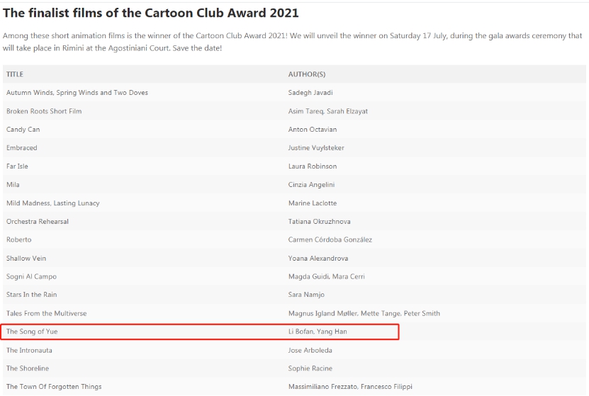(通讯员 张若琦)6月29日,2021意大利Cartoon Club国际动画电影节官网发布入围名单,我校动画与数字艺术学院五部师生作品榜上有名,其中教师作品《越女长歌》入围短片竞赛单元(Cartoon Club Award),学生作品《蜉蝣日记》《讨厌鬼》《奇怪的她》。《琴语》联袂入围学生竞赛单元(Signor Rossi Award),这也是继去年之后我校作品的再度入围。