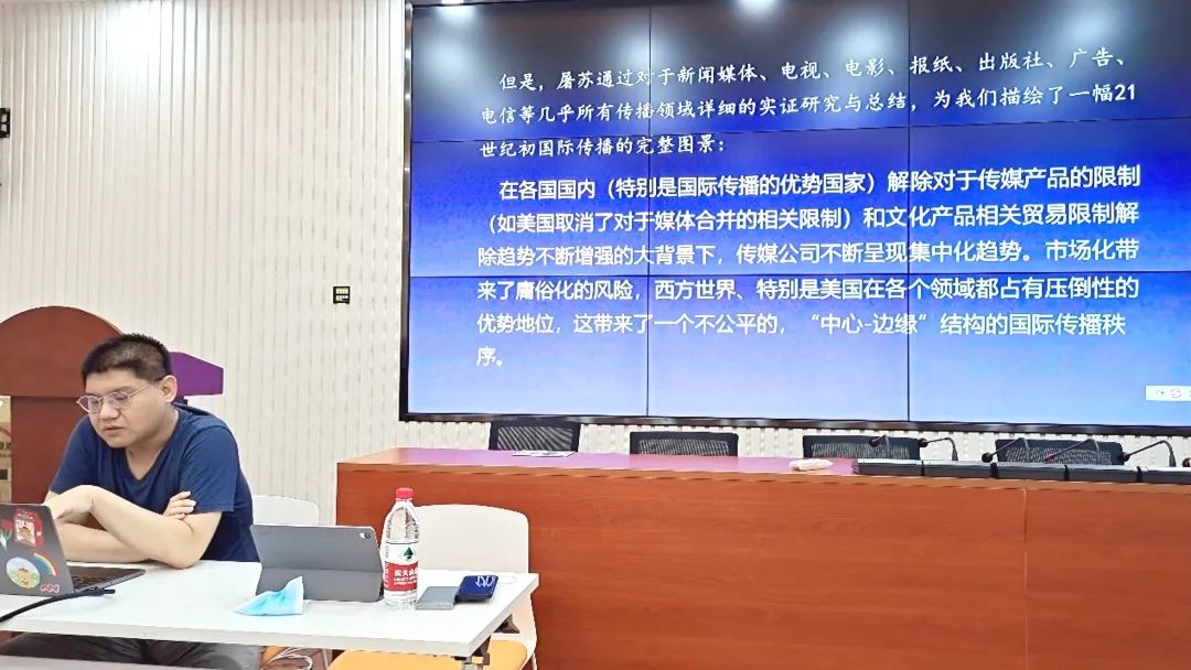 20级传播学博士研究生于凡分享了达雅·屠苏的《国际传播:延续与变革》(董关鹏 译)一书。他首先为大家进行了“国际传播”与“对外传播”的概念辨析,提到“国际传播结构是对外传播的时代背景,国际传播结构的形成对于做好对外传播有着重要参考价值。”他随后对本书的内容做了梳理和评析。他讲到,西方世界特别是美国在许多领域占有优势地位,这带来了一个不公平的、“中心-边缘”结构的国际传播秩序。西方媒体的强势改变了第三世界国家的关注点、态度取向,且暗含着双重标准的风险。