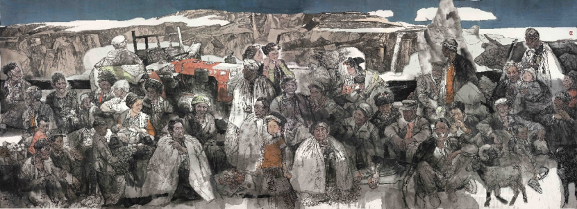 经过对画面构成、笔法、形式、色彩关系等要素的分析处理,李宽教授确定以横幅构图的形式来表现作品主题和内容,男女老幼38人、三只羊、三头牛、农、一个很接地气的拖拉机、远处的高山流水和蓝天白云共同组成了这幅作品。38人表情自然,体现了生活真实;三头牛、三头羊是山里人形影不离的伴侣,很好地丰富了整体构图;拖拉机增加了画面的现代感,蓝天白云则是纯净自然的最好体现。