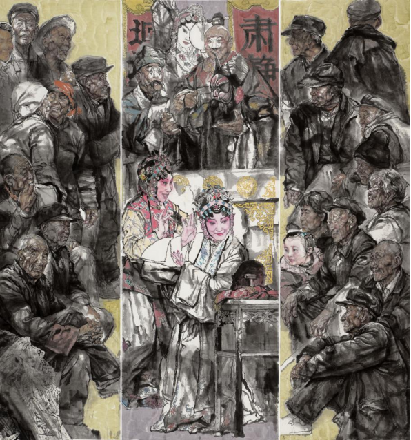 劳政超同学申报的作品《乡戏》,将演员表演和观众观看的场景放在一起,展示了“送戏下乡”活动现场的氛围。就观众而言,作品着重表现不同年龄、性别和身份的群众在享受文化下乡福利时,或喜悦、或惊奇、或专注的精神状态,生动展现了当下乡村群众对于高质量精神文化生活的迫切需求。就演员而言,作品选取了传统戏曲中观众耳熟能详,具有代表性的角色和情节进行表现,如《牡丹亭》《李逵探母》《墙头记》等,以此来表现优秀传统文化对群众积极向上的思想引导,也很好地丰富了广大农民的精神生活。