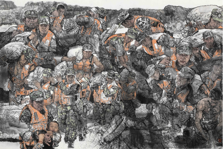 李宽教授的作品《众志成城》用写实性水墨绘画记录了抗洪救灾的伟大场景,反映了抗洪抢险斗争中形成的万众一心、众志成城,不怕困难、顽强拼搏,坚忍不拔、敢于胜利的伟大抗洪精神。作品在充分尊重历史的基础上,发挥艺术想象力与创造力,达到了历史真实与艺术真实的完美统一。