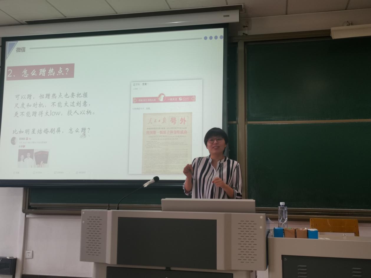 7月14日下午,人民网运营部内容总监董菁在我校四十八教B401开展了主题为“新媒体时代,党政机关官方账号运营实战”的讲座。