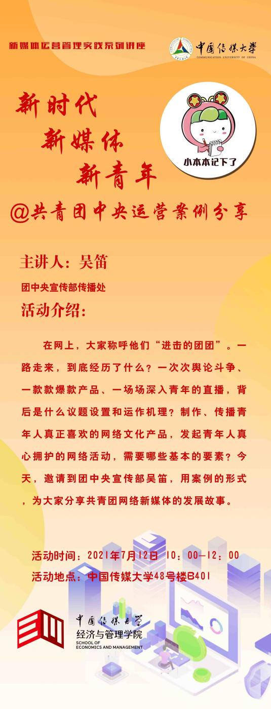 7月12日由于暴雨预警,原定于线下的讲座改为线上开展,团中央宣传部传播处吴笛老师带来了主题为“新时代 新媒体 新青年—共青团中央新媒体运营案例分析”的讲座。