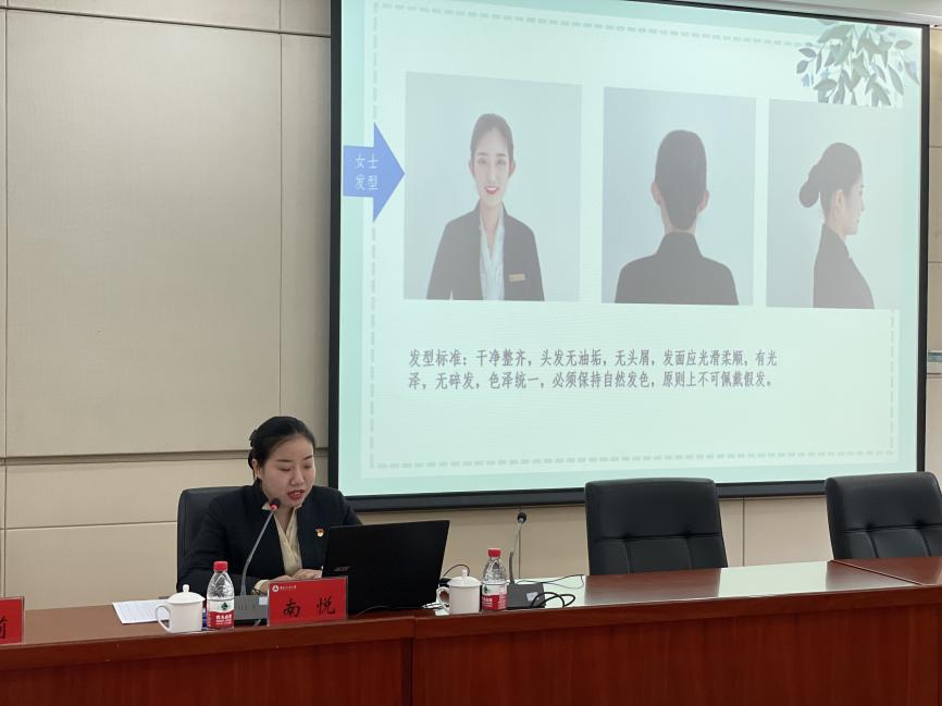 下午的培训,以实操内容训练为主,南悦老师结合会议服务工作实际,从会议礼仪、会议场型、会议服务三个方面进行教学,并采取现场教学、分组测试、一对一指导的形式训练参训人员的站姿、走姿、坐姿、蹲姿及面部表情等形体训练。