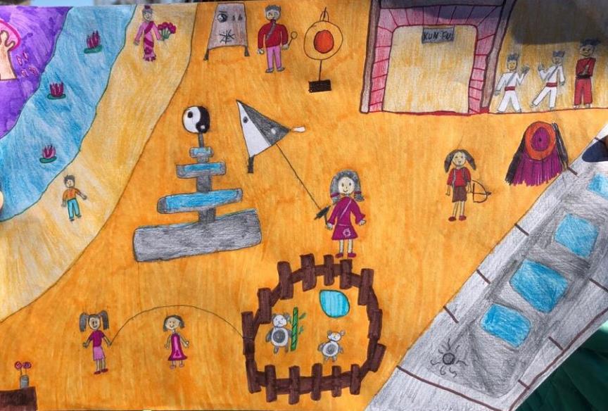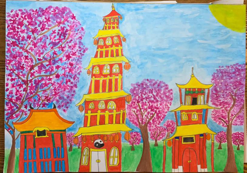 作品中有的是孩子眼中传统的中国,红墙黄顶的的古代庙宇楼台;有的是孩子们眼中的现代中国,上海外滩的高楼大厦、繁华的都市、飞机高铁;有的是传统与现代相结合的中国;还有戴着口罩的行人、带有太极元素的建筑、风筝,还有武馆……点点滴滴展示出孩子们脑海里对古老而现代的中国的各种理解