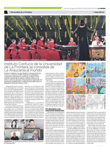 智利8月27日出版的全国性主流媒体《三点钟报》、8月17日出版的阿劳卡尼亚大区报纸《南方报》都对活动进行了报道,再度提升了孔子学院及我校在智利的美誉度和影响力。