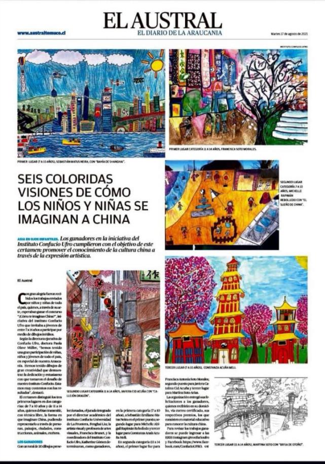 (通讯员 白镓铭 孙玉红)近日,我校共建的智利边境大学孔子学院举办的“我眼中的中国”小学生绘画比赛圆满落幕。比赛从今年6月至8月,历时近三个月,最终六幅作品脱颖而出,分获一、二、三等奖。智利全国性主流媒体和所在大区报纸对此次活动进行了报道。