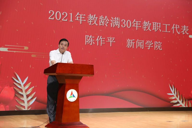 2021年教龄满30年教职工代表、新闻学院陈作平老师深情回忆了30年来在中国传媒大学执教、工作和生活的点点滴滴。他表示,教师是一个以爱心为底色的、有理想、有追求的职业,在传道授业解惑的背后,不仅要有一颗仁爱之心,还应将个人发展与学科、学校、国家发展紧密结合起来,实现个人与祖国的同频共振。
