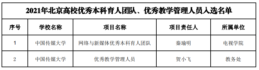 (通讯员 薛玉莲)日前,北京市教育委员会公布了2021年“优质本科课程”和“优质本科教材课件”遴选结果以及2021年“北京高校优秀本科育人团队”和“北京高校优秀教学管理人员”评选结果,我校推荐的优秀本科育人团队、优秀教学管理人员、4门优质本科课程、4部优质教材课件项目全部入选。其中,《传播学概论》入选优质本科课程重点项目,《 传播学基础:历史、框架与外延(第3版)》入选优质本科教材课件重点项目。