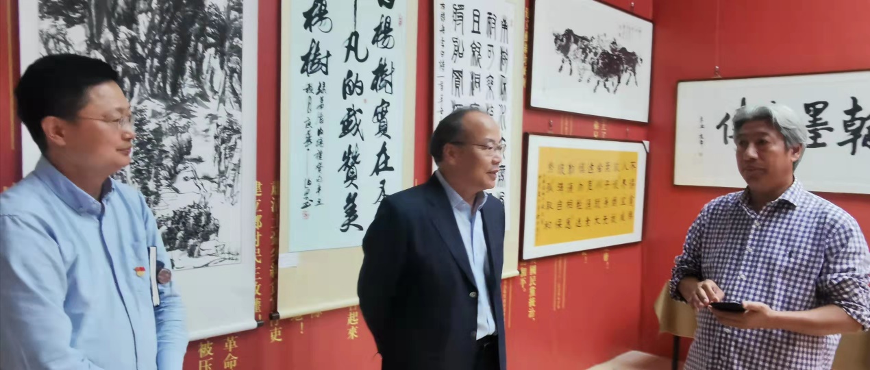 (通讯员 白婧妍)细雨濛濛,翰墨飘香。9月24日,“翰墨中传——庆祝中国共产党成立100周年暨迎国庆72周年”书画展在我校广告博物馆开展。校党委常委、副校长、工会主席刘守训现场参观。