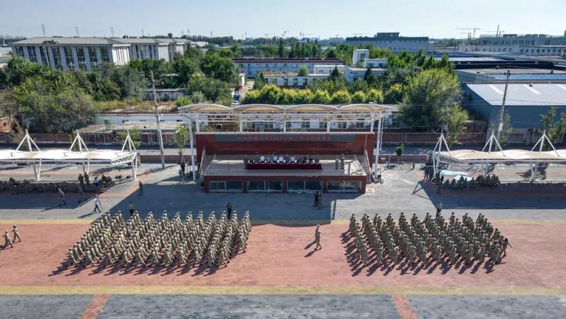 在军训成果汇报表演中,两个基地的参训学生分别表演了匕首操、刺杀操、军体拳、擒敌拳、格斗术、长棍术、连队列、旗语展示以及战术综合演练。汇报表演在校歌《校园里有一排年轻的白杨》合唱中圆满落下帷幕。