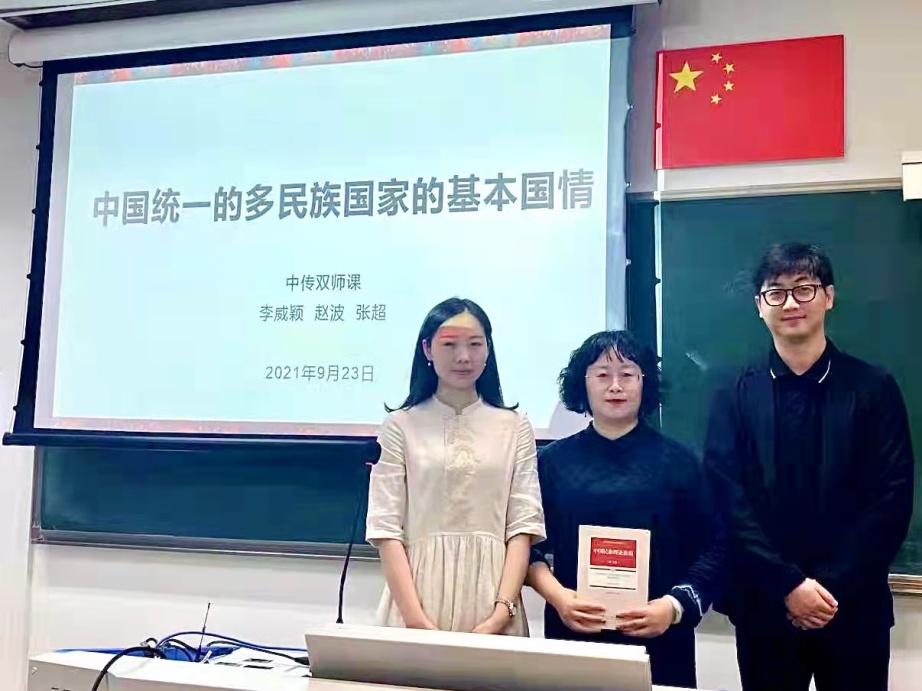 作为由思政课教师与专业课教师共同教授的“双师”教学实践探索,此次课程由马克思主义学院赵波老师、李威颖老师与音乐与录音艺术学院的张超老师同堂讲授。教学团队组织了多次线上+线下集体备课会,综合运用对话、访谈、情境和专题教学方法,用心打造一堂有趣又有料的“民族理论与民族政策”课程。