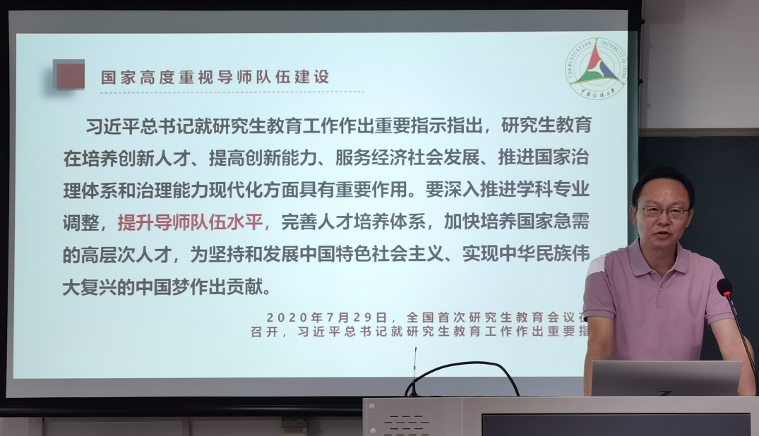 党委教师工作部部长王晓丽就高校教师师德师风建设相关规定与新晋导师进行了分享。王晓丽部长引用《中华人民共和国教师法》《高等学校教师职业道德规范》《教育部关于高校教师师德失范行为处理的指导意见》《教育部关于全面落实研究生导师立德树人职责的意见》以及《中国传媒大学师德考核实施办法》等多份文件,清晰明确地强调了师德师风问题的重要性。