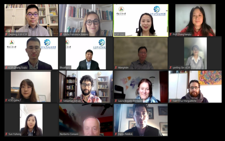 本次中拉线上会谈由中国传媒大学人类命运共同体研究院特约研究员钟婉初博士和阿根廷国立拉普拉塔大学国际关系学院中国研究中心主任玛丽亚·弗朗西斯卡·斯塔亚诺联合主持,参会者还有中国传媒大学人类命运共同体研究院副院长王四新、姬德强,办公室主任葛艳玲,博士后张苏秋,孔子学院管理办公室孙玉红,国际部李喆;阿根廷国立拉普拉塔大学国际关系研究院拉美研究中心主任劳拉·博加多·博达扎尔,中国研究中心研究员胡安·克鲁斯·马格利什、塞巴斯蒂安·舒尔茨、迭戈·里迪克。