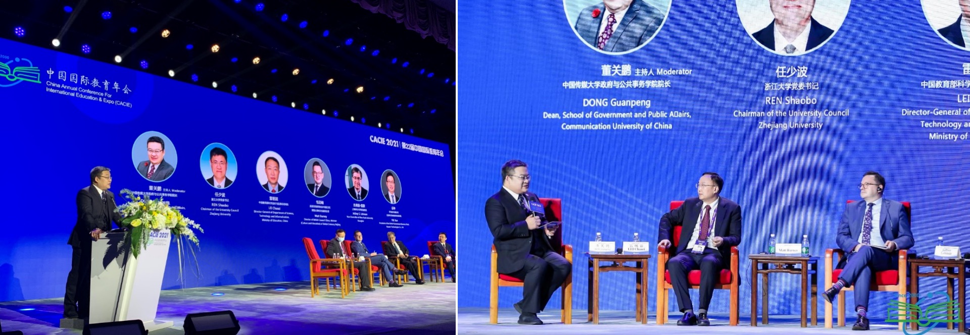 我校政府与公共事务学院院长董关鹏教授受邀担任年会全体大会专题研讨主持人。研讨中,浙江大学党委书记任少波,中国教育部科学技术与信息化司司长雷朝滋,英国文化教育协会中国区主任、英国大使馆文化教育公使包迈岫,上海纽约大学常务副校长雷蒙以及华为技术有限公司全球政府业务部总裁岳坤聚焦国际教育前沿动态展开深度对话,为后疫情时代国际教育合作高质量发展建睿智之言、献务实之策。