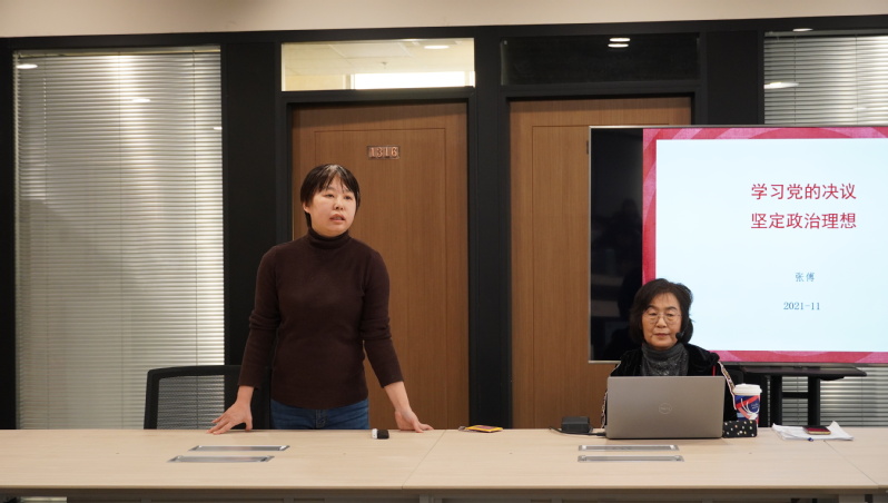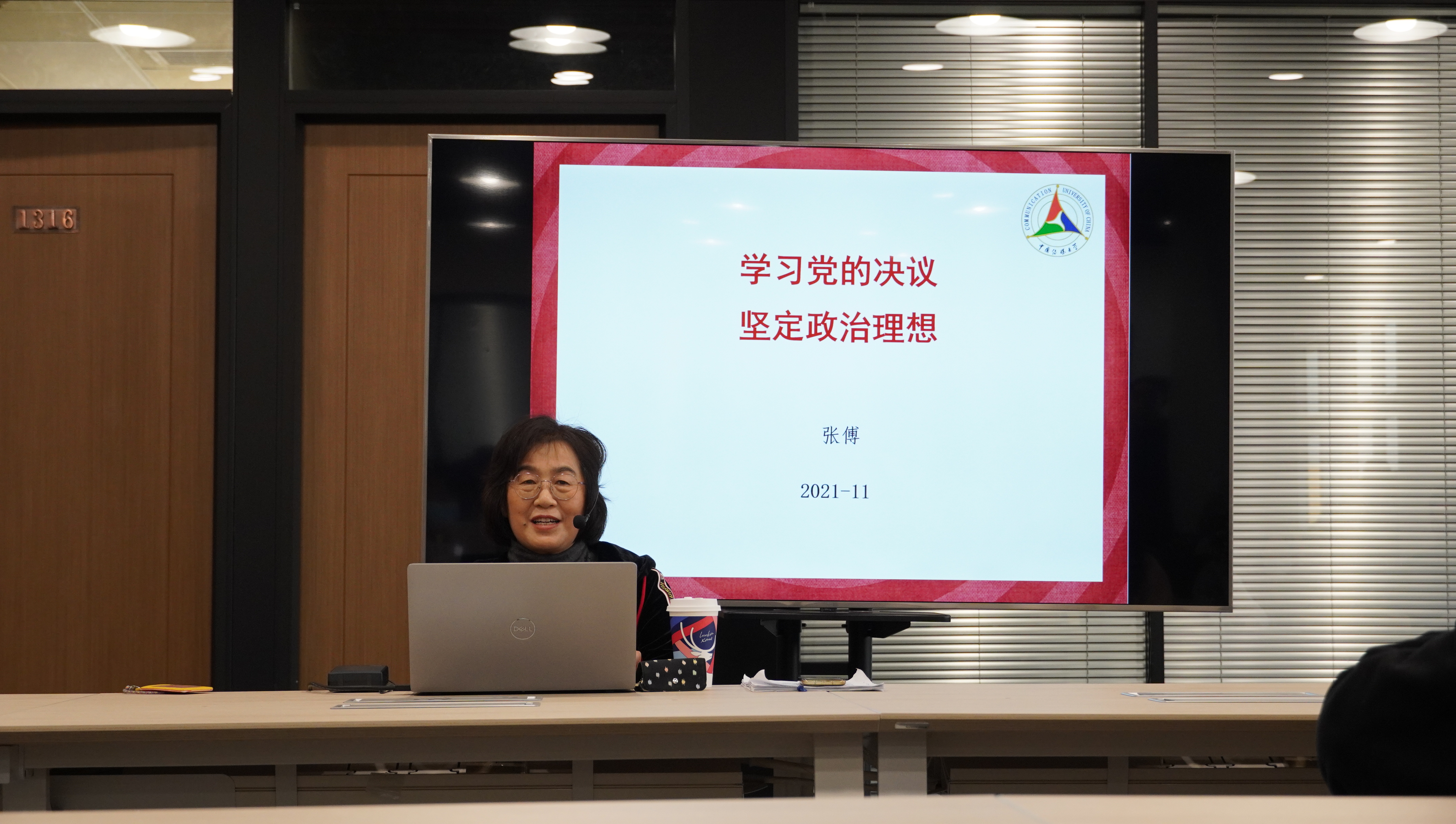 张傅教授从深刻把握党百年奋斗的重大成就、深刻领会党百年奋斗的历史意义和历史经验、坚定政治理想,做好育人工作三个方面系统解读了《决议》精神。她表示,要坚持用习近平新时代中国特色社会主义思想铸魂育人,源源不断把各方面先进分子特别是优秀青年吸纳进党组织,引导青年树牢“四个意识”、坚定“四个自信”,深刻领悟人民领袖的核心作用,以新气象新作为创造新的历史伟业。张傅教授特别告诫同学们要树立远大理想,坚定理想信念,听党话、感党恩、跟党走。
