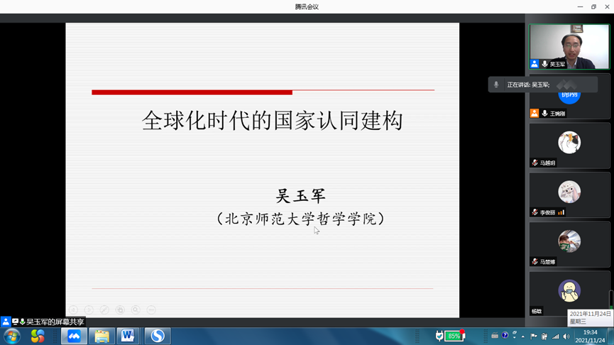 (通讯员 王锦刚)11月24日,马克思主义学院举办的“新时代讲堂”于线上开讲。首期主讲嘉宾为北京师范大学哲学学院吴玉军教授,讲座的题目是“全球化时代的国家认同构建”。马克思主义学院院长刘东建教授对讲座进行了点评,讲座由马克思主义学院副院长王锦刚教授主持,马克思主义学院师生60余人线上参加了讲座。
