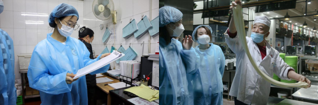在工作人员的引导下,同学们前往后厨各个工作间进行参观,详细了解餐具清洗消毒、食品储存、饭菜加工等各个环节,查看食堂疫情防控管理相关记录,更亲身参与饭菜制作与打饭服务环节。根据疫情防控及食品安全卫生的相关要求,同学们在活动前进行核酸检测,同时穿着一次性防护服进入后厨等重点区域,做好登记。