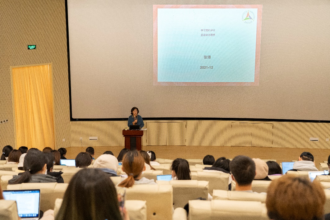 张傅教授的领学主题为“学习党的决议 坚定政治理想”,她围绕“为什么中国共产党需要发表政治宣言”这一问题,从党的历史观出发剖析了中共中央关于此次《决议》的历史背景和制定过程,并从“党百年奋斗的重大成就”“深刻理解党百年奋斗的历史意义”“深刻领会党百年奋斗的历史经验”和“坚定政治理想 做好育人工作”四个方面深刻解读了《决议》内容。张傅教授表示,《决议》强调“要源源不断把各方面先进分子特别是优秀青年吸收到党内来”这一内容,充分体现出党对于青年人的重视及寄予的期望,希望广大青年党员牢记使命,奋发向前。