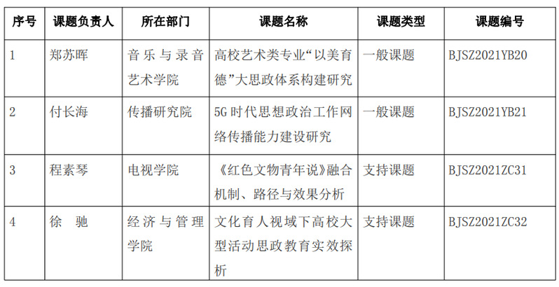 (记者 张旭)近日,由北京市委教育工委委托北京高校思想政治工作研究中心开展的2021年度北京高校思想政治工作研究课题申报立项名单揭晓,我校4项课题获准立项,其中,一般课题2项、支持课题2项。