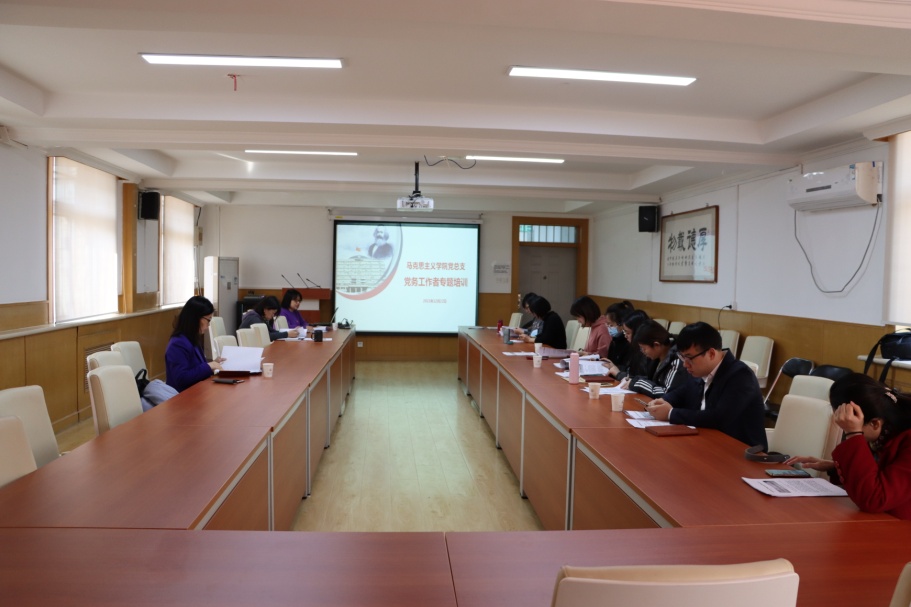 (通讯员 孙靖)12月22日下午,马克思主义学院党总支面向学院全体师生党务工作者开展专题培训,党总支书记傅楠主持并主讲,学院组织员、党总支干部、师生党支部支委参加培训会。