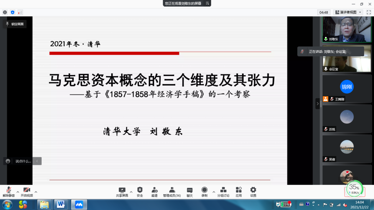(通讯员 王锦刚 张静敏)12月22日下午,马克思主义学院举办“新时代讲堂”第二讲,特邀清华大学马克思主义学院刘敬东教授作题为“马克思资本概念的三个维度及其张力”的讲座。讲座采用线上线下相结合的方式,马克思主义学院师生40余人聆听了讲座,并与刘敬东教授进行了互动交流。