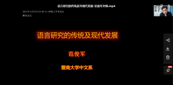 12月23日晚,暨南大学文学院教授范俊军教授为全院师生带来了本次系列讲座的最后一讲——“语言研究的传统与现代发展”。范俊军教授从认识论和方法论两个视角阐述了语言学研究的“传统”原理和“现代”理论。从认识论来看,“传统”具有可知性、原旨性、多源性、实践性、迭代性、慈乳性、恒久性等特点,而“现代”具有共同实践性、人本主位性、社会选择性、一体多元性、普遍事实性、科学唯理性等特点。从方法论看,语言学的“传统”研究方法是历史主义与唯物主义的结合,而“现代”理论的特性则主要运用结构主义、实践主义和实验主义的方法。通过对比“传统”与“现代”,范俊军教授总结出了语言研究中“传统”及“传统研究”的相关问题,并提出“传统”在“现代”中的复苏和创新方式。