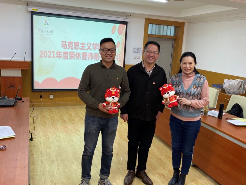 学院院长兼党总支副书记刘东建代表学院为即将迎来本命年的两位老师赠送了福虎布艺玩偶,祝福老师们2022年平安顺意、虎虎生威,也祝愿学院发展龙腾虎跃。