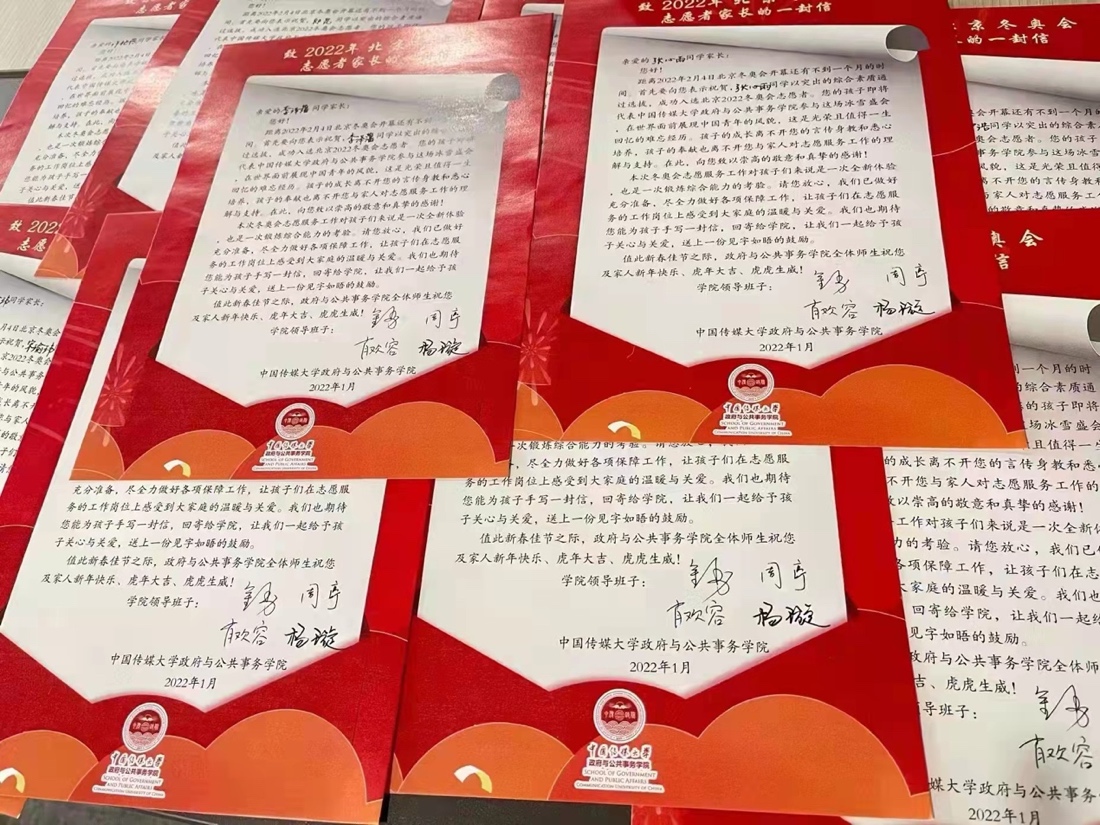 为保障冬奥志愿者们在校生活、学习和工作,学院专门组织召开冬奥志愿者座谈会,为志愿者们发放新年贺卡和爱心礼包,学院领导班子还为每位志愿者家长寄出亲笔签名的慰问信,感谢家长对志愿服务工作的理解与支持,邀请他们为孩子写下一封信,共同见证冬奥盛会,感受孩子的成长。家长们也给学院寄来回信,纷纷表示感谢学院和学校对孩子们的关怀,祝愿同学们圆满完成冬奥志愿服务工作。