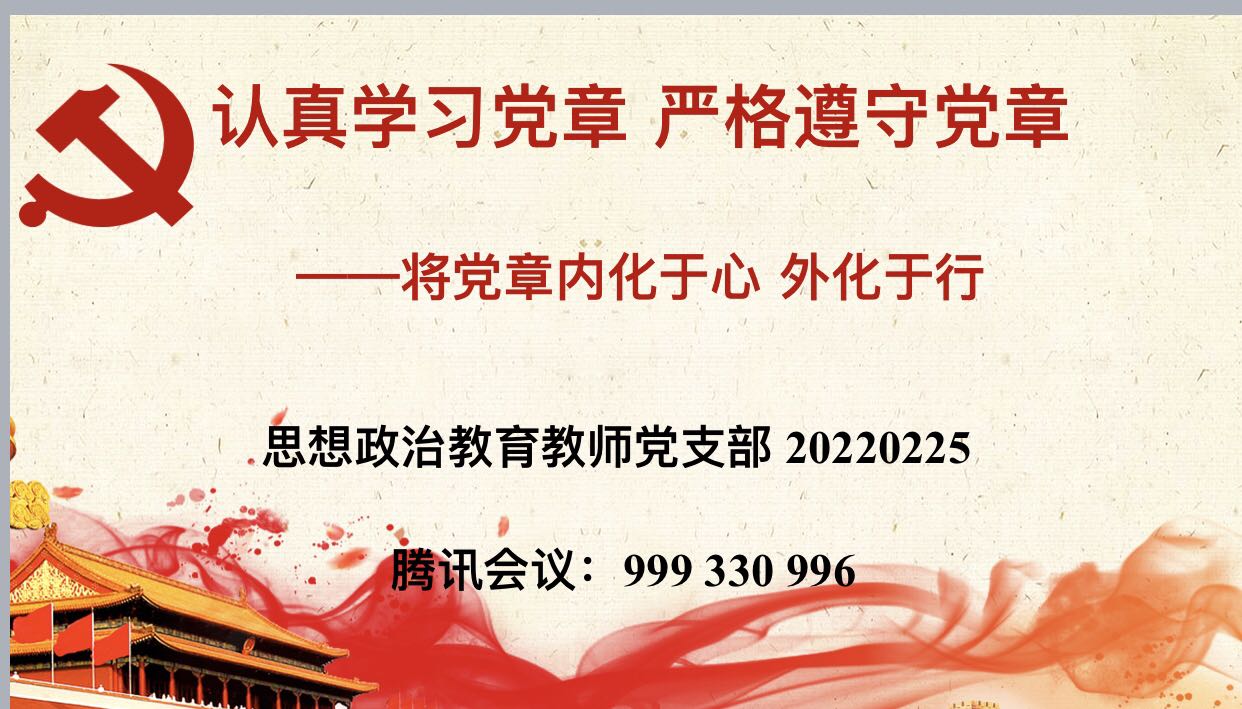 (通讯员 须大为 张静敏)党章是党的“根本大法”,是全党必须遵循的总规矩,也是每一名党员常读常学的必修课。2月25日,马克思主义学院党总支所辖两个教工党支部召开线上专题会,集体学习党章党纪党规,全体党员参加了学习。