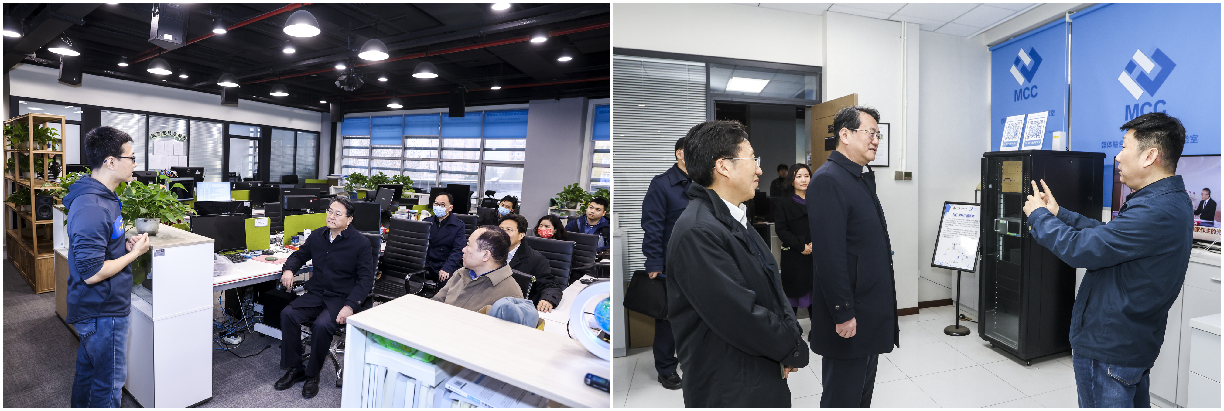 座谈会前,崔建民局长一行现场调研考察了我校全景多声道编程控制系统及声效重建播出、媒体融合技术与5G智能运用、电影音频修复新工艺、高新视频云制作系统团队的研究情况和应用成果。
