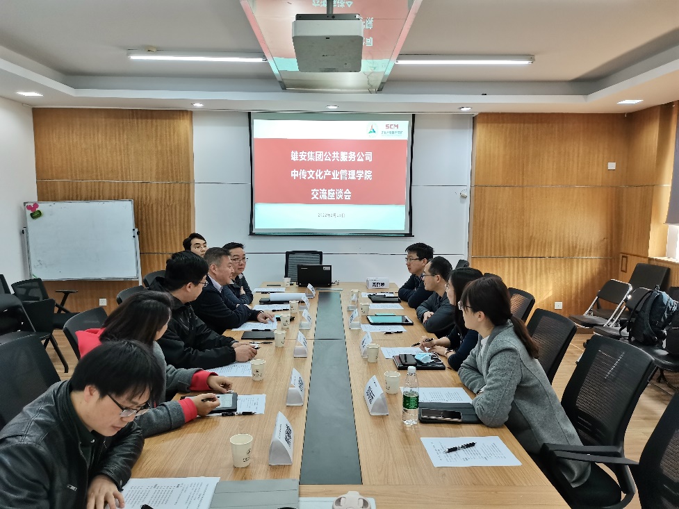 (通讯员 叶怀阳 陈舒婷 摄影 陈舒婷)3月15日,雄安集团公共服务公司副总经理梅冰、胡文瑾一行到文化产业管理学院调研交流,文化产业管理学院执行院长张洪生、副书记朱敏,校园建设处副处长江帆出席接待并座谈。
