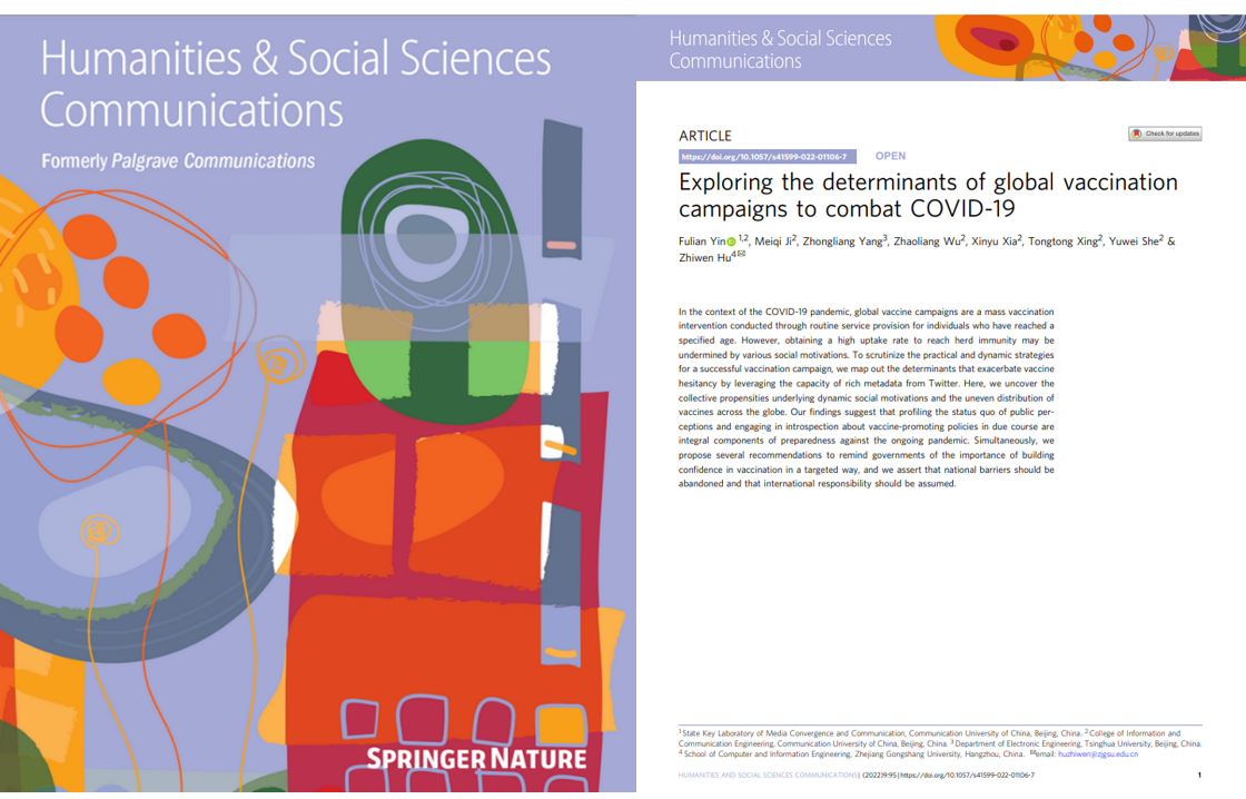 (通讯员 冀美琪)经过多年科研攻关,我校信息与通信工程学院殷复莲教授课题组取得了网络信息传播动力学领域研究系列进展。近日,课题组以“Exploring the Determinants of Global Vaccination Campaigns to Combat COVID-19”为题在Nature旗下唯一面向人文与社会科学的期刊Humanities & Social Sciences Communications发表研究论文。中国传媒大学为论文第一单位,论文第一作者为殷复莲教授,第二作者为我校信息与通信工程学院研究生冀美琪,第三作者为清华大学电子工程系博士后杨忠良,通讯作者为浙江工商大学计算机与信息学院胡智文教授。
