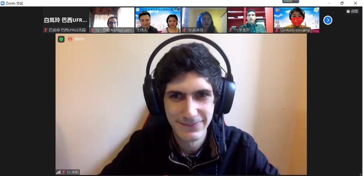 (通讯员 刘思楠)巴西圣保罗时间2022年5月29日,第21届“汉语桥”世界大学生中文比赛巴西赛区预选赛以线上方式举办。我校共建巴西南大河州联邦大学孔子学院选送的选手宋明(Samuel Nunes Sant' Anna)夺得巴西赛区冠军,方聪(Rodrigo Lerner Gutterres)获得本次大赛的优秀奖。宋明也是我校远程在读的人文学院汉语国际教育专业本科生,他将代表巴西参加世界“汉语桥”大学生中文比赛总决赛。