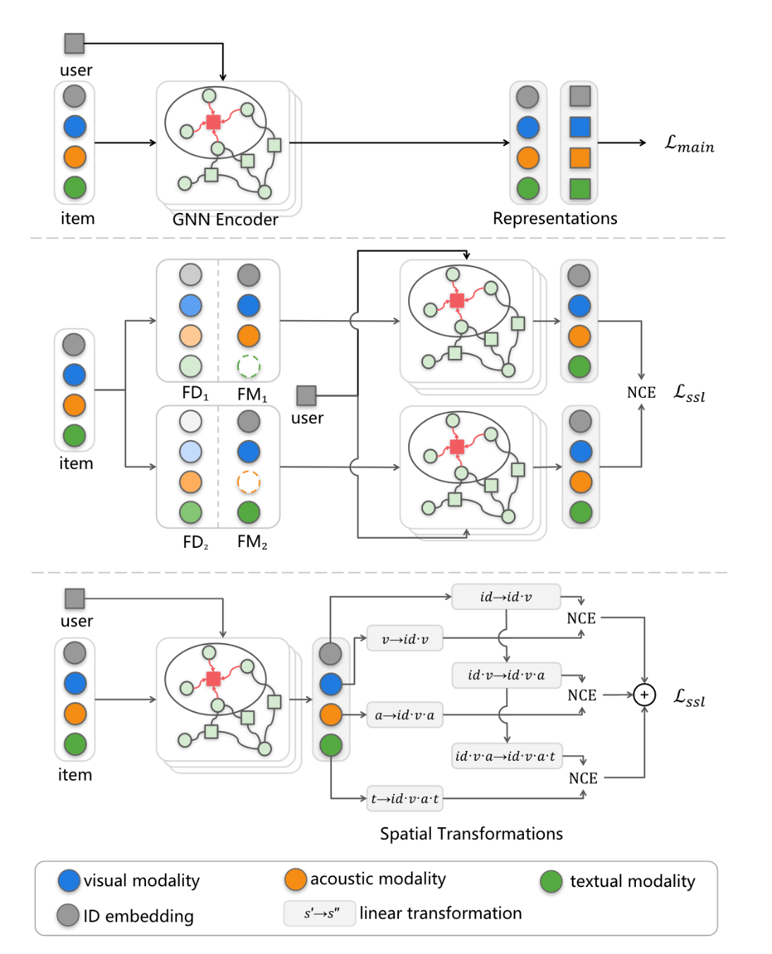 本论文将自监督学习(SSL)融合进多媒体推荐中,构建了SLMRec模型,在数据增强和对比学习的范式设计了三种不同维度的SSL方式:特征丢弃(feature dropout)、特征遮盖(feature masking)和粗细粒度对比(fine and coarse space)。SSL的引入与改进使得多媒体推荐模型能更好地建立模态之间的关联,并学习到更强的多模态表征,克服了多媒体内容表征粗糙造成的表示能力欠缺问题。本模型相比发表于 SIGIR’20 会议上的LightGCN模型,在Tiktok、Kwai、Movielens三个不同的数据集上Recall@10提升了78.30%、23.58%、72.68%,Precision@10提升了86.000%、45.02%、73.97%。
