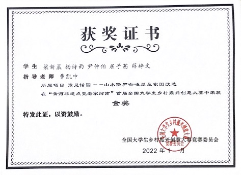 (通讯员 武瑶)日前,由中国城市科学研究会、河南省文化和旅游厅、河南省教育厅、浙江省教育厅、浙江省文化和旅游厅主办的首届全国大学生乡村振兴创意大赛获奖名单公布。由我校戏剧影视学院环境设计系曹凯中老师指导的多名学生在大赛“黄河之村”非遗赋能空间赛道中脱颖而出,共获得金奖1项、银奖2项。