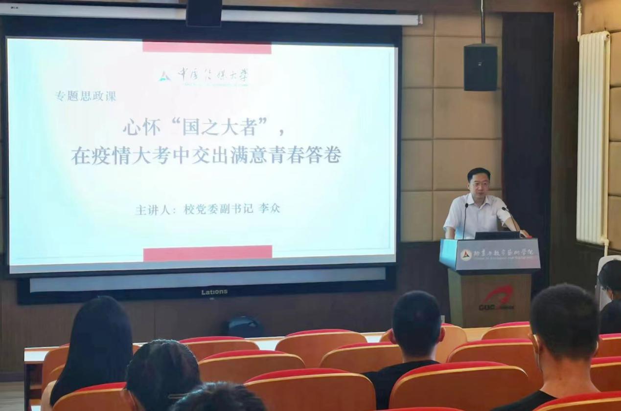 (通讯员 陈萌)6月13日下午,校党委副书记李众在动画与数字艺术学院报告厅讲授“心怀‘国之大者’,在疫情大考中交出满意青春答卷”专题思政课。各学院在校生学生代表、校园疫情防控学生党员先锋队代表、青年先锋队代表听取了专题思政课。