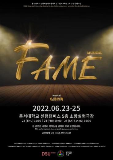 百老汇经典音乐剧《名扬四海》(Fame)是2020级音乐剧双学位班同学们赴韩国东西大学第二学年第二学期交流学习期间的汇报演出剧目。《名扬四海》讲述的是发生在美国纽约艺术高中的真实故事。一群才华横溢、来自不同文化背景与家庭环境的少男少女,从四面八方汇聚到了一起,希望通过在艺术高中的学习实现自己的艺术梦想。经过四年的大起大落、欢笑与泪水的洗礼,他们逐渐认识到,想要“名扬四海”就必须脚踏实地,而非幻想中的“一夜成名”。