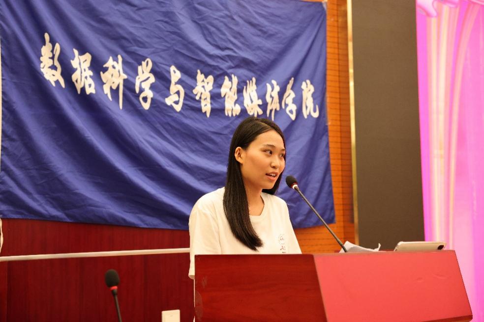 本科生新生代表2022级数据科学与大数据技术(1班)李奕可同学,从开学的隔离经历切入,致敬并感谢了为同学们保驾护航的老师们;讲述了两周的网课感受,引用“弘道崇德,经世致用”指出,每一代青年都有自己的机遇和挑战,要专注学习,提升自己的专业能力,超越自我,要有梦想,也要有脚踏实地的勤恳与钻研。